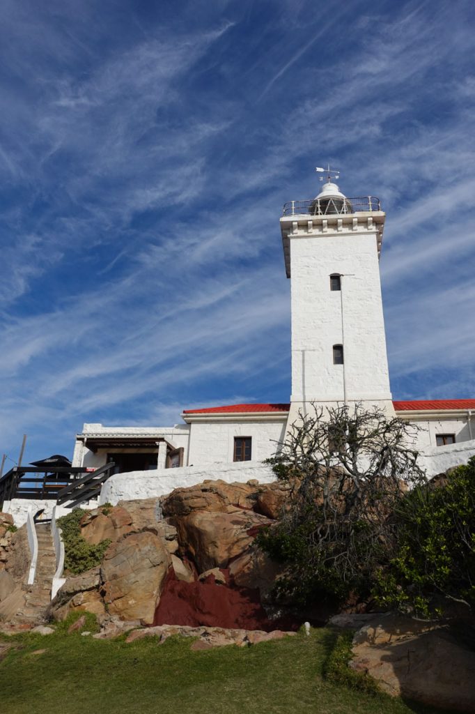 Shortly before reaching the lighthouse there are some wood steps leading up from the path to the left, these go up to a suburb and not to the lighthouse and the point so stay on the footpath. The path starts descending, passing between boulders, past the lighthouse fence and steeper down to the cave below the lighthouse and then into the parking lot at the end of the trail. At the point where you are walking next to the lighthouse’s fence you can keep left and follow a path around the lighthouse to a gate where you can enter the lighthouse complex. There is a restaurant at the lighthouse where you can enjoy a well deserved coffee, drink or meal with a view over The Point and the Mossel Bay bay. If you chose to take this short detour, just retrace your steps back around the complex and then down the path and past the cave to the parking area.