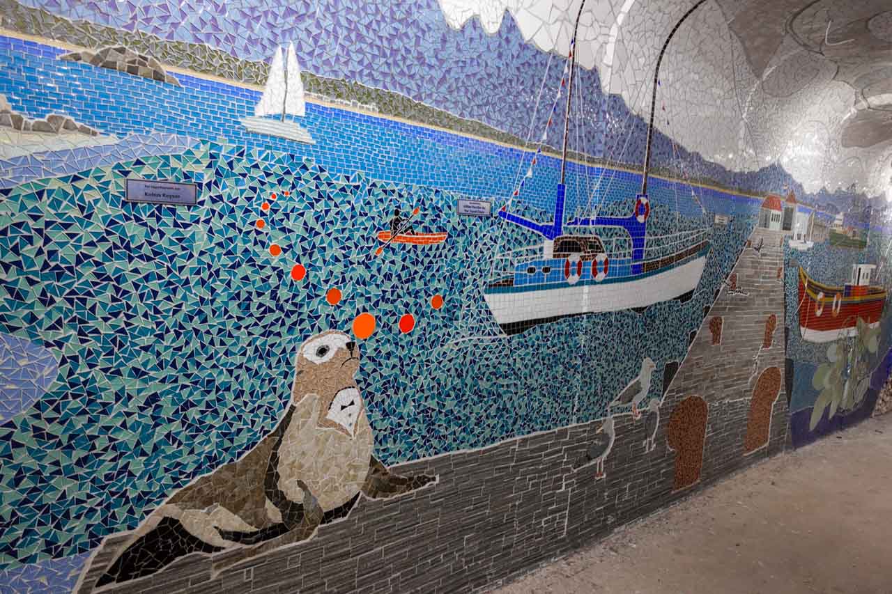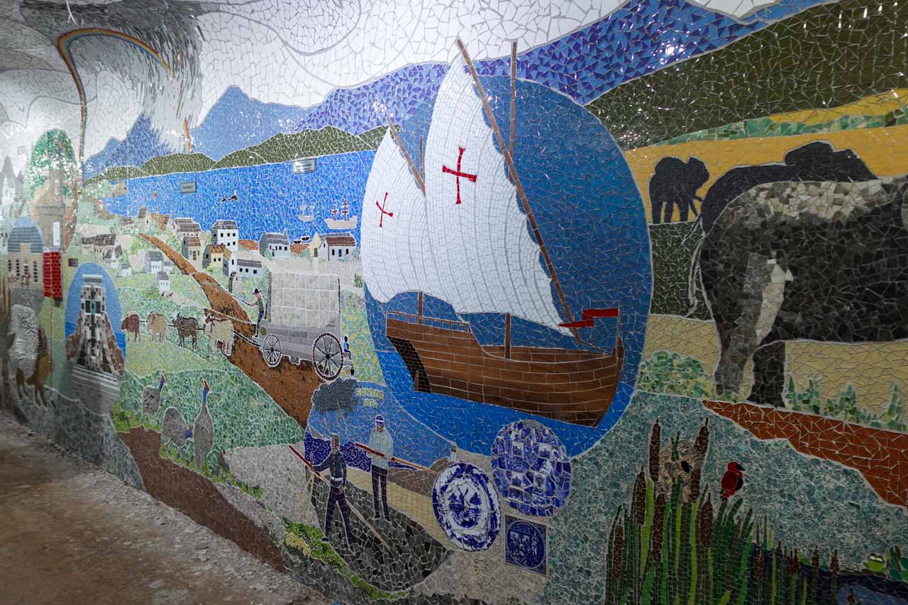 Just over 4km from the start you will pass or cross over a wooden boardwalk that leads down to the sea from the Pinnacle point Clubhouse. This is a good opportunity to head down to the beach if you would like to do so, this is a beautiful bay and we stood here for a while watching dolphins play in the waves. As you step onto this boardwalk, to your left you will see an underground tunnel that leads to the clubhouse, it is well worth stepping inside this tunnel and be mesmerised by the amazing mosaic depicting Mossel Bay’s history and interesting sights of the area, The Iconic Mosaic Tunnel Project. It is truly spectacular.
