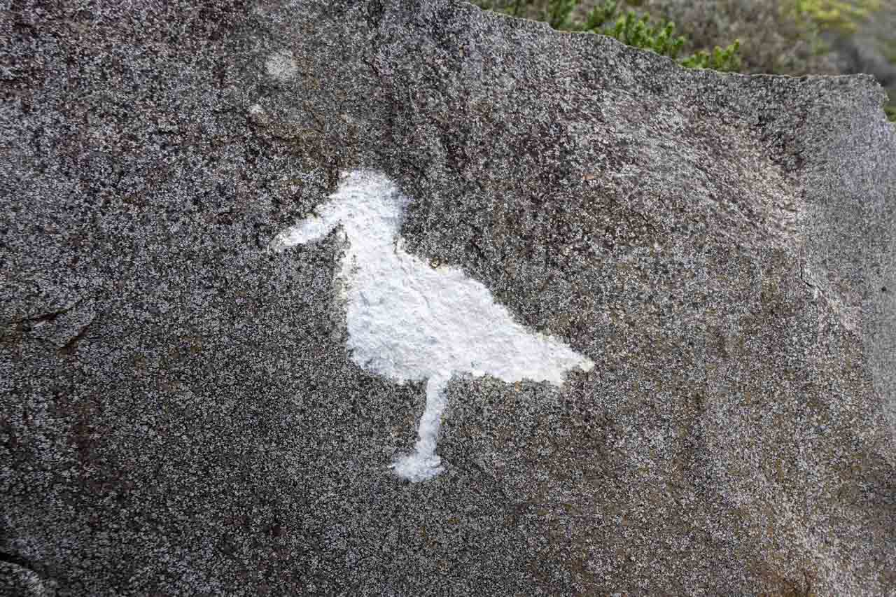 Route markers: Bird silhouette painted in white or green on the rocks.